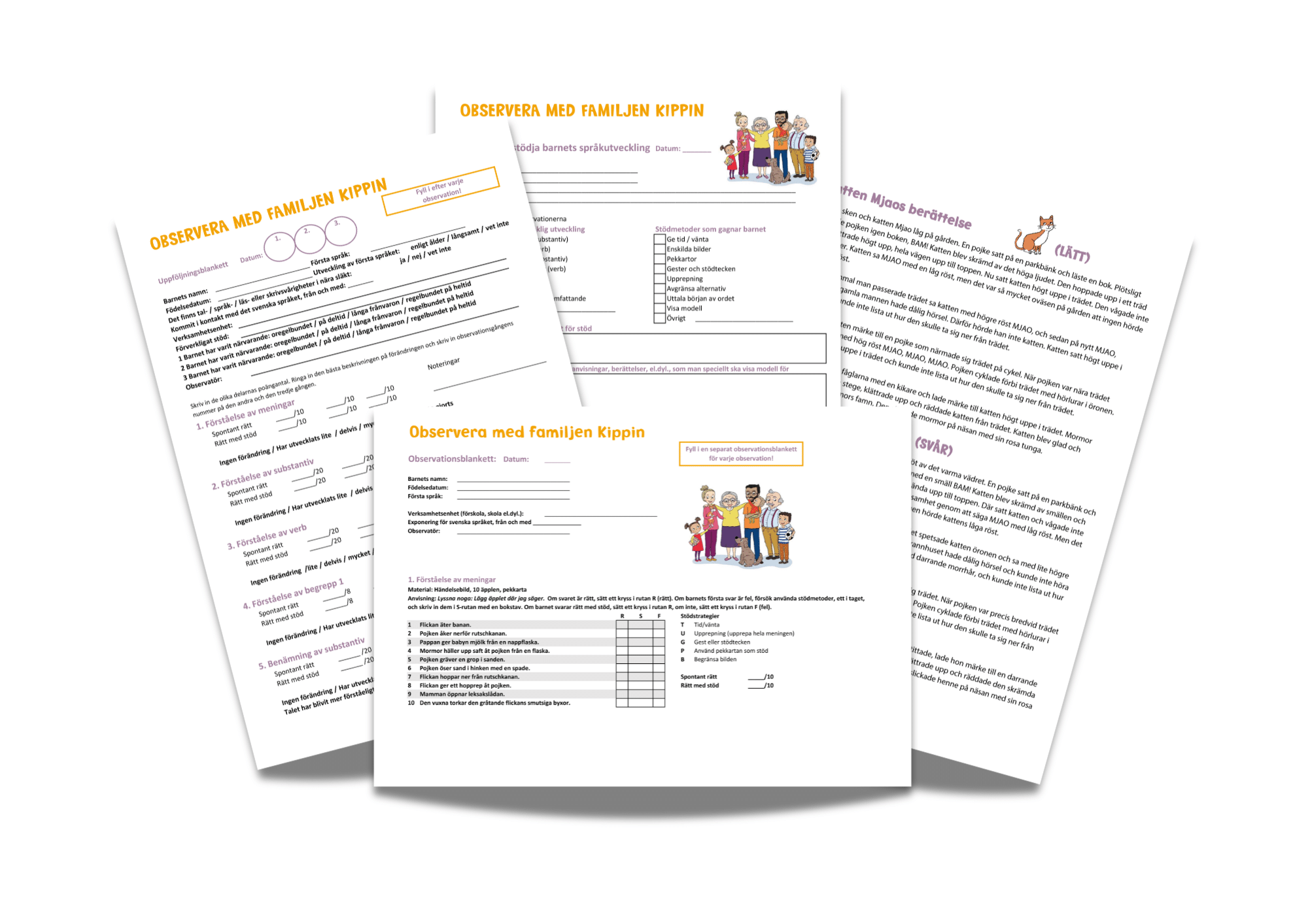 Observera med familjen Kippin lämpar sig för kartläggning och uppföljning av språkliga färdigheter hos cirka 3–8‑åriga en- och flerspråkiga barn. Materialet innehåller bildstöd i form av pekkartor, vilket möjliggör en mångsidig kartläggning av barnets språkliga kunskaper. Tack vare bildstödet kan barnets språkförståelse och uttrycksförmåga komma fram även om talet ännu är begränsat. Materialet innehåller dessutom stöd för planering av språkliga insatser.